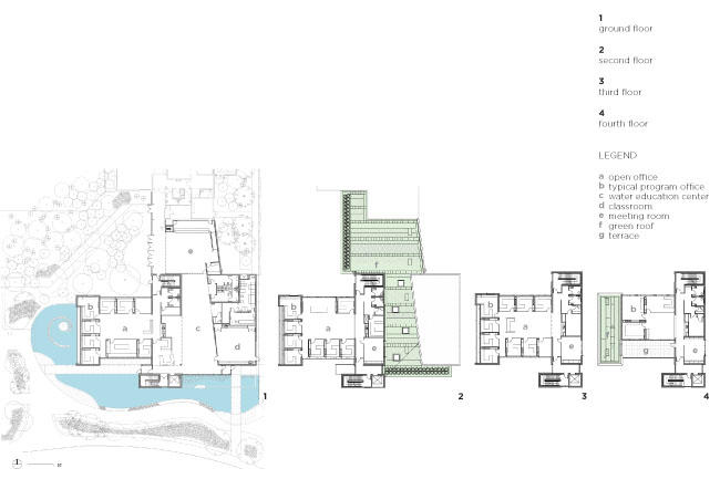 The concept of celebrating water as a precious resource is one that informed almost every design decision. It informed the building's relationship to its site and adjacent projects, anchored the landscape design and public plaza, influenced the selection of native plants and irrigation design, informed the interpretive exhibits, and fostered significant water reduction strategies.