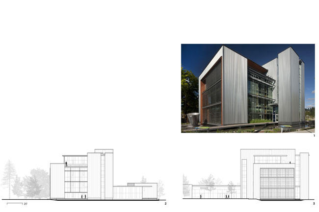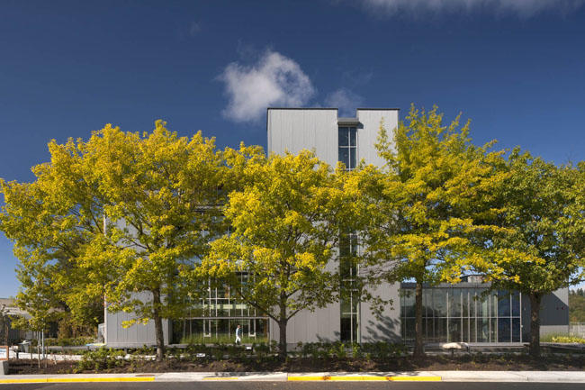 At the south façade, the motorized louver system was integrated with exterior sun shades to improve daylight distribution. The louvers serve as a series of small light shelves that reflect light up onto the highly reflective, stretched-fabric ceiling. The north portion of the project reaches out to connect to an existing building that was renovated to house a modern laboratory and lunchroom, and the north-facing offices are open to Olympic Mountain views. The east façade is minimally glazed and encloses core functions.
