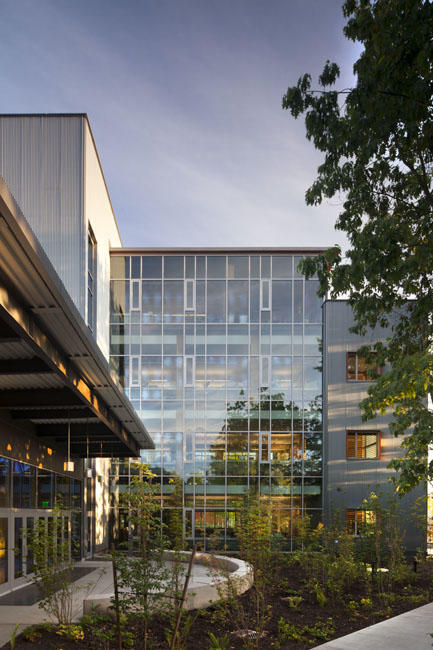 Other strategies include a dedicated outside air system with heat recovery that delivers outside air directly to the occupied spaces with a minimal amount of energy required to temper the air. A water-to-water-source heat pump is the primary source of domestic hot water for the building, and a run-around heat recovery loop in the laboratory also captures heat from the fume hood exhaust system and uses it to temper the outside makeup air.