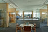 The façade and daylighting strategies implemented in the offices are further enhanced by narrow floor plates and a highly reflective stretched-fabric ceiling. By assuring that all interior spaces are less than 30 feet from exterior glazing, these floor plates, in cooperation with interior glass office partitions and the reflective ceiling, enable daylight to penetrate deep into the spaces and reduce the need for artificial lighting. The glass partitions also provide dramatic views and are one reason that 93% of the building spaces have access to views.