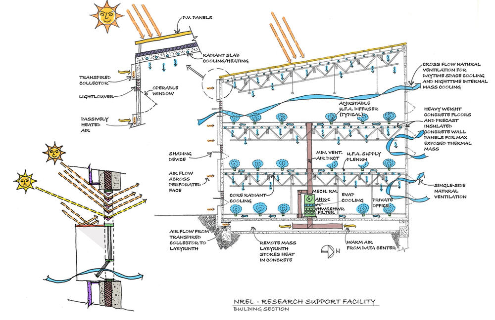 As our client at NREL notably said, "every design decision has an energy impact." The net-zero energy goal for this project amplified every design decision and explicitly shaped the building and resulted in a positive impact on the program and functionality of the building. The building is a simple architectural response to the climate, site, and ecology that envelop it and the desire for a flexible, high-performance workplace within. Many of the integrated passive design strategies, such as daylighting and natural ventilation, strongly support both energy performance and human performance. The form of the building is driven by energy, with its long and narrow office wings connected by a central spine, forming an "H" shape. In fact, the building section was the first drawing sketched to understand how to harness passive energy.
