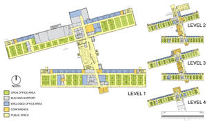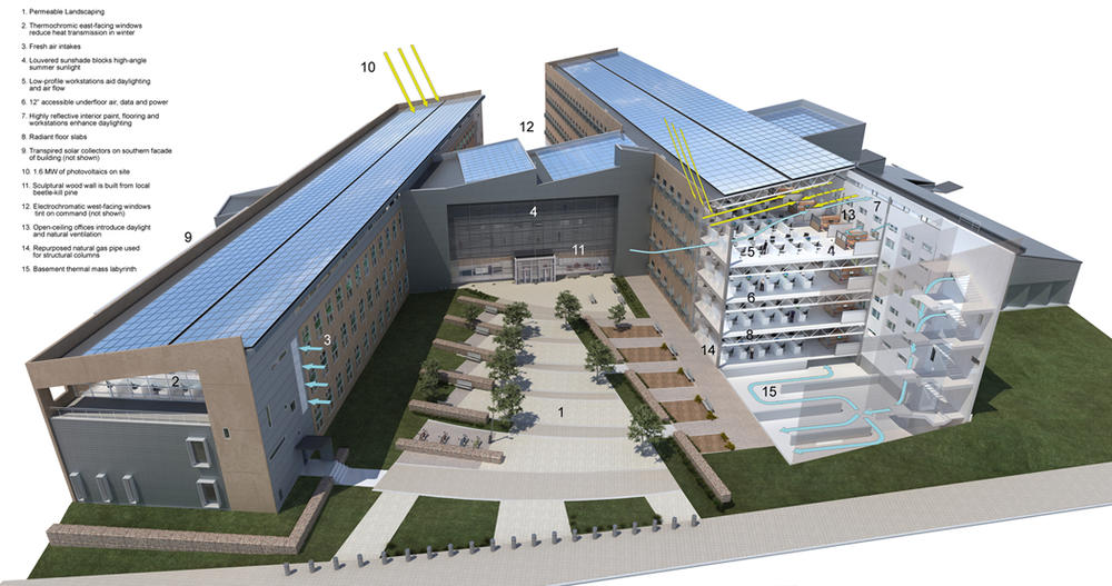 The building massing and window design optimize control and harvesting of daylight. Virtually every workspace in the main office wings is daylit. Overall, 92% of all regularly occupied spaces are daylit. Air quality is enhanced by increasing the amount of outside air delivered to spaces. All office spaces have 100% outside ventilation air delivered through an underfloor air distribution system. The ventilation system is decoupled from the space conditioning system, saving significant energy.