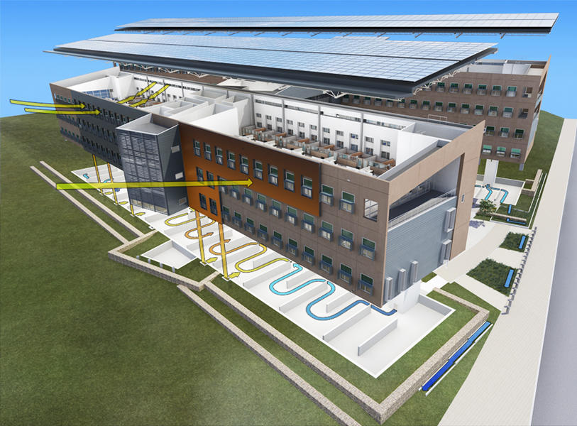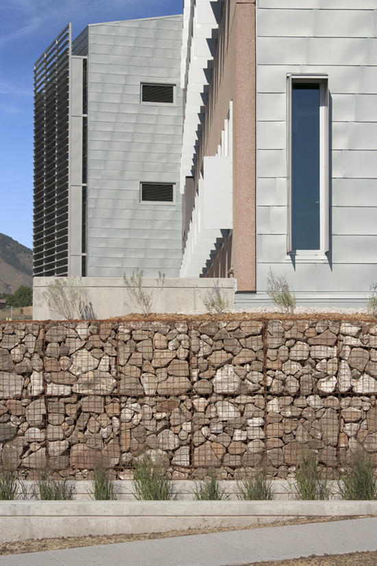 The building and site are part of the overall ecosystem and are rooted with a strong sense of place. The building is formed around the forces and natural resources of the climate and the site. The building responds not only to sun and wind but also to the natural lay of the land and the context of the existing campus. The landscape design paid particular attention to natural stormwater management techniques, open space preservation, permeable paving systems, native landscape integration, use of high-albedo pavements, and the innovative use of onsite excavated rock for gabion walls.