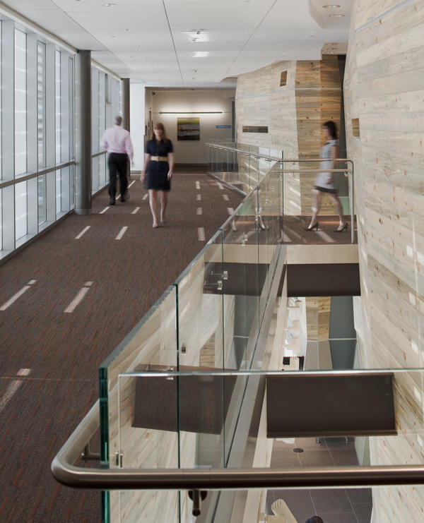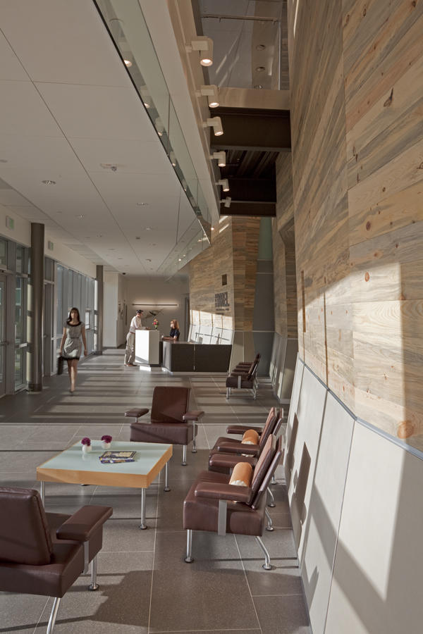 The material choices for the building were driven by the desire to have flexible and durable materials with low health impacts and reduced resource consumption. Construction waste diversion (75%), low-emitting materials, recycled-content materials (34%), regional materials (13%) and certified wood materials (59%) were all incorporated based on LEED compliance. Several highly visible, innovative materials were also incorporated into the project, including the use of reclaimed natural gas pipe as structural columns and beetle kill pine used as decorative wall elements throughout and as a multi-story feature wall in the lobby.