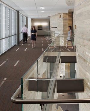 Flexibility and adaptability are key sustainable design features but also very important workplace design strategies. The 60' deep office wings have column-free interiors, and the cores are small and decentralized to allow the basic core and shell of the building to have tremendous flexibility.