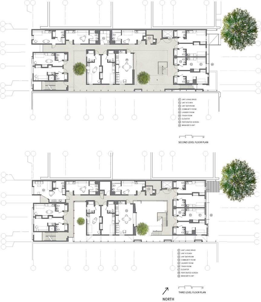 The existing site location was analyzed for proper orientation and heat gain and differences between the local and regional climates. A number of passive strategies resulted from this analysis. The decision during pre-design to make the units small (250 ft2) allowed the client to serve a larger mentally disabled and homeless population while increasing density above 250 dwelling units/acre.