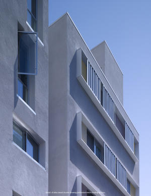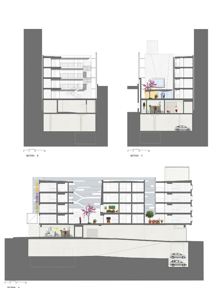 Shading is provided for the building, and both courtyard spaces through the perforated screens. These features significantly reduce the reliance on fossil fuels. Cooling is only provided in the ground floor commercial space, the two offices, and the two managers' units. All other units are designed with windows on opposite walls to induce natural cross-ventilation and abundant natural light.