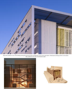 The biggest challenge was to overcome the year-round substantial temperature differential between day and night. To compensate for this condition, concrete floors and some concrete walls were strategically placed and used as thermal heat sinks. Perforated metal screens are building-integrated and form canopies that shade the building. A decorative metal screen at south-facing glazed areas help to control and regulate summer and winter heat gain. Dual glazing with a low-e film was utilized in aluminum frames to control the indoor thermal environment.