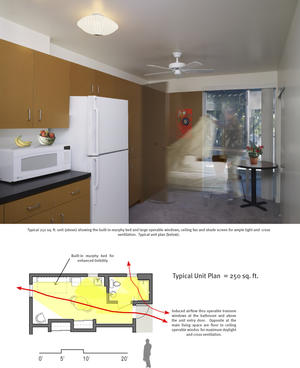 Although the studio units have limited floor area, the units have 10-foot-high ceilings, ceiling fans, and large windows with lots of natural light and abundant cross-ventilation. Indoor air quality was emphasized by minimizing offgassing. Formaldehyde-free cabinetry, low-VOC paints, natural linoleum, and fluorescent lighting with low mercury content were used to minimize pollution from materials.