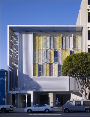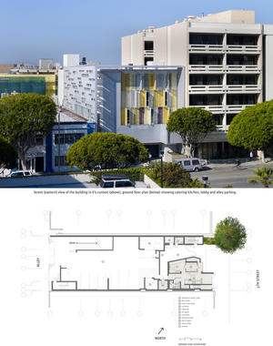 This mixed-use project provides 46 studio apartments of permanent affordable housing and supportive services for the homeless and mentally disabled population in the heart of downtown Santa Monica. The density of the project is 258 dwelling units/acre, which exceeds the average density of Manhattan by more than 10%.