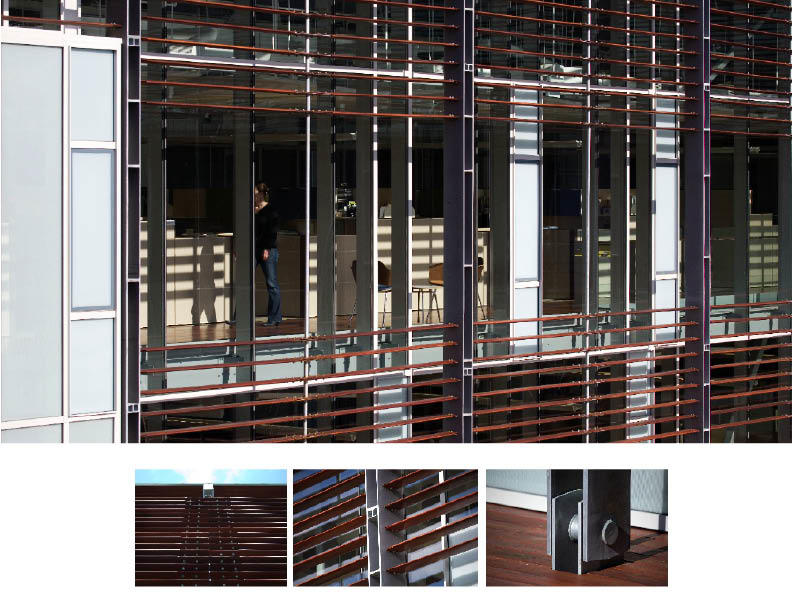 Ninety-one percent of the wood in the building was harvested from managed forests. Fifty-three percent of the wood is certified by the Forest Stewardship Council (FSC), recognized by LEED as the most stringent forest management organization. The exterior decks and louvers are constructed of jarrah wood, which is in abundant supply in Australia and has a 10- to 15-year growth cycle, much shorter than the 50-year growth cycle of an oak tree. Jarrah is naturally fire- and rot-resistant, and requires no chemical treatment.