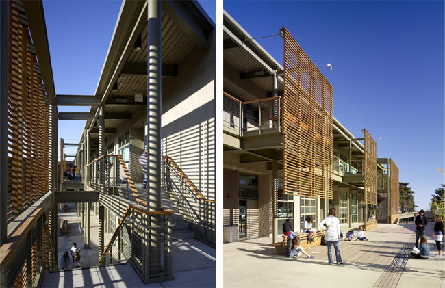 The classroom building's exterior corridors provide sun control and protection from winter storms. The south-facing student center, conceived as an enclosed “band shell,” can be completely opened to the outdoors in warm weather, eliminating the need for extensive exterior shading. Narrow floor plates, ceiling fans, and wind-powered turbine ventilators allow 85% of all interior spaces to be passively ventilated and cooled.
