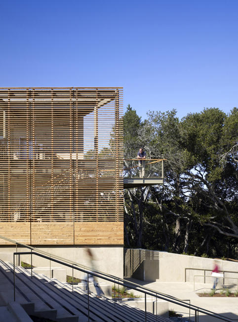 The project replaced an 18,000-ft2 parking lot with new structures designed to protect and enhance the native ecosystem. The project team carefully preserved majestic native oak trees and nonnative cypress trees, and new landscaped open space covers 123% as much area as the building footprint. The team derived building materials and colors from the materials of the site, reinforcing a visceral connection to the land.