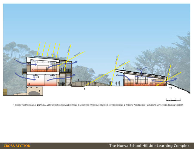 Building systems: The design exceeds California Title 24 by 32% through building orientation, additional insulation, earth sheltering and high performance glazing. High efficiency gas-fired boilers provide radiant, in-floor hydronic heating to all spaces. Tankless water heaters and water conservation measures combine to reduce domestic hot water energy and emissions. Natural ventilation, augmented by ceiling fans, eliminates mechanical air conditioning in virtually all spaces. Energy-efficient lighting is operated by occupancy sensors throughout.