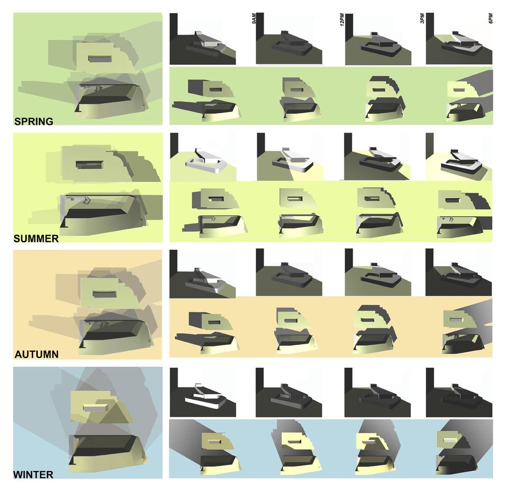 The cold climate of the Northeast presented a unique set of challenges for the design of the building. The project team situated the building so a large percentage of surface area faces south, allowing for the use of passive solar strategies for heating. The walls and green roof are designed with an exceptionally high R-value, well above state energy code minimum requirements, which ensures the heat obtained from solar gain is not lost. The generously sized windows, which often span the length of an entire room, are double-glazed and thermally insulated. Operable windows provide substantial opportunity for natural ventilation in the cooling seasons. To further provide interior comfort in the more immediate urban climate, the insulated walls and windows add to the acoustic qualities of the indoor spaces. The window frames and double glazing serve to protect occupants from the noise of the adjacent bus station, train terminal, and overhead planes. The building's massing is derived partly from zoning regulations, but also from detailed solar studies. The primary purpose of these studies was to avoid shading the adjacent buildings and roof terrace.