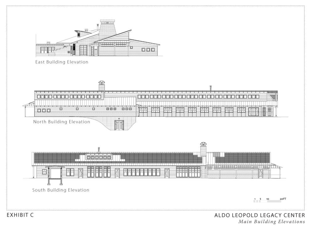 The Aldo Leopold Legacy Center was designed to last at least 100 years. Every design decision was made with a view toward the long term. The project was designed to fit within its ecological landscape, using materials that will age gracefully over time. The main building's simple, stable shell is constructed of durable materials. The anticipated service lifetime of the aluminum roof exceeds that of other roofing options. Roof overhangs keep water off exterior walls and windows, improving durability.