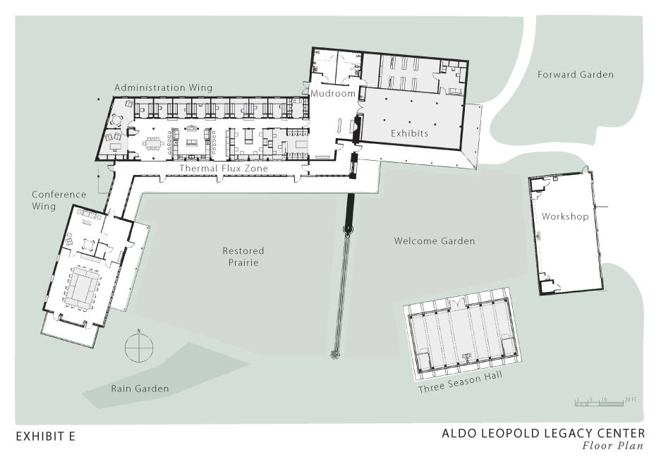 The headquarters for the Aldo Leopold Foundation, the Legacy Center includes office and meeting spaces, an interpretive hall, an archive, and a workshop organized around a central courtyard. Built where Leopold died fighting a brush fire in 1948, the Legacy Center also provides a trailhead to the original Leopold Shack.