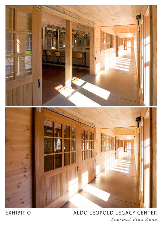 Thinning the Leopold forests improved forest health while providing 90,000 board feet of wood for use in the project. More than 75% of all wood used in the project was certified to Forest Stewardship Council standards, and 60% of all materials were manufactured within 500 miles of the project site.
