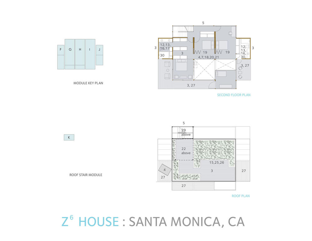 The house is constructed of factory-built modules that were erected on the site-built foundation over a period of 13 hours; the structural slab-on-grade serves as the finish floor for the first level. A roof deck offers views and a green roof with vegetation native to southern California.