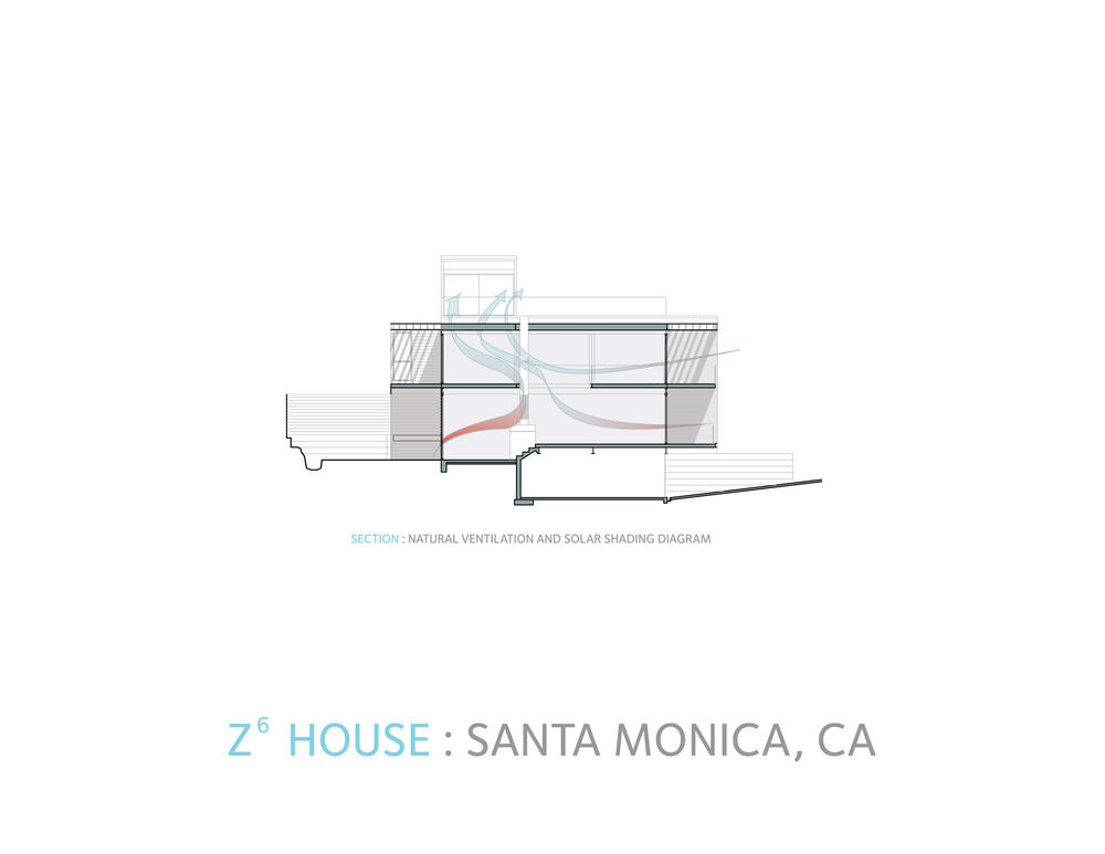 The Z6 house has a very low energy profile in part because it has no forced-air heating or cooling. The building takes advantage of natural ventilation from the prevailing breezes, with an open plan and a whole-house fan drawing air up through the top of the home. The house was designed to optimize passive solar heating, with glazing to admit winter sun and balconies placed to shade the house from summer sun. A radiant floor heating system is powered by a solar hot water collector.
