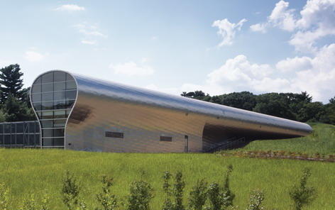 The facility is a piece of sculpture. Because of the building's shape, the team wanted its exterior to have a satin sheen that would pick up the qualities of landscape and sky and change with the light conditions and seasons. The sliver is made of prefabricated steel hoops enclosed with metal decking and then clad with flat-lock, stainless steel shingles. The thin shingles warp in two directions, stiffening them and minimizing denting. The shingles absorb some heat from the sun, but the form and shape of the shingles allow it to radiate the heat as the solar gain moves quickly to the edge of the material and dissipates.