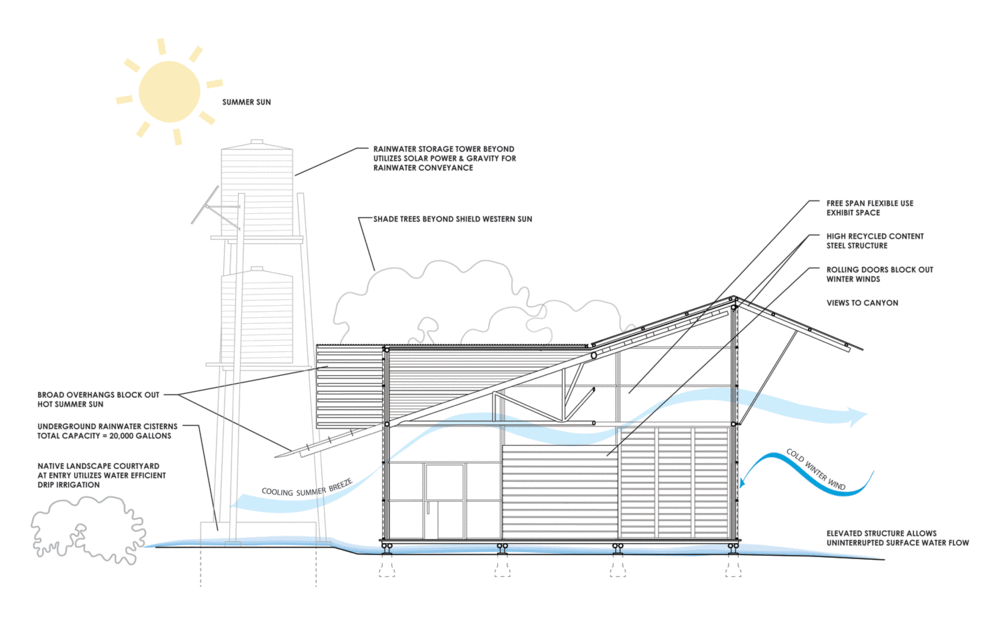 The design team aimed to minimize impacts on the landscape and fragile water resources and to do more with less. The development was concentrated to reduce landscape water usage and physical impact on the site. Extraneous space was eliminated, reducing material use, energy use, first cost, operations cost, and maintenance needs. Exhibit and circulation spaces, originally programmed as indoor spaces, were designed as sheltered and shaded outdoor spaces, accepting summer breezes but protected from north winds. These spaces are not air-conditioned, reducing conditioned space by 35% and further reducing material and energy costs.