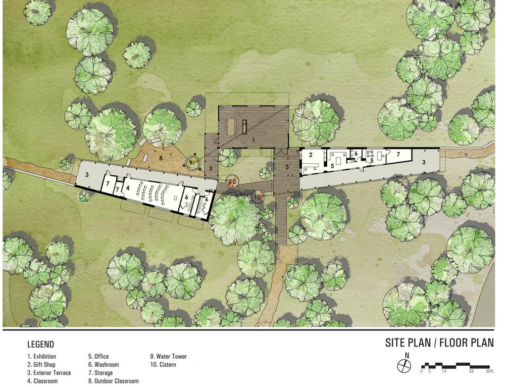 The Visitor Center has two wings that form portions of long low stone walls. The porch of the administrative wing forms a welcoming approach overlooking a native plant court, which serves as a collection point for rainwater storage. The elevated central exhibit space opens up beyond the court to views of the restored savannah and the canyon beyond. This elevated structure allows for uninterrupted surface water flow and cooling breezes. The classroom wing porch opens up to an outdoor gathering area adjacent to the rainwater collection tower, forming the heart of the group educational zone.