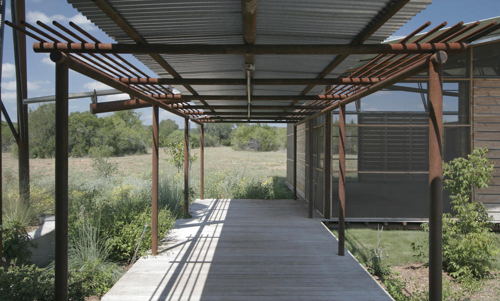 The stone walls were constructed of stone quarried within 50 miles of the project site. The eastern red cedar siding, a byproduct of central Texas suburban development, was harvested locally and is used under the cover of the broad overhangs on the porches. This siding is naturally resistant to decay and was left to silver naturally with no additional coatings, stains, or paints to maintain over time. Lumber certified for its environmentally responsible harvesting makes up the decking surface at raised platforms.