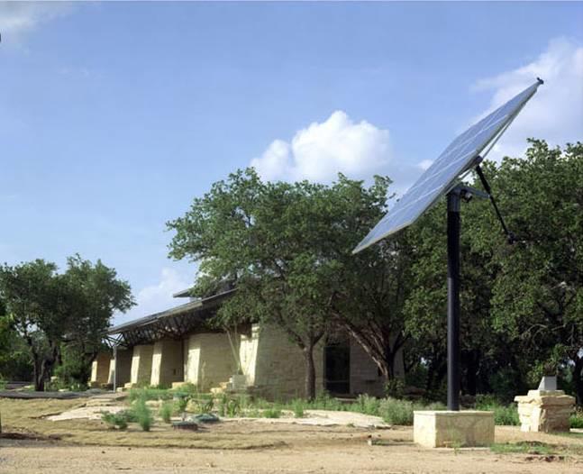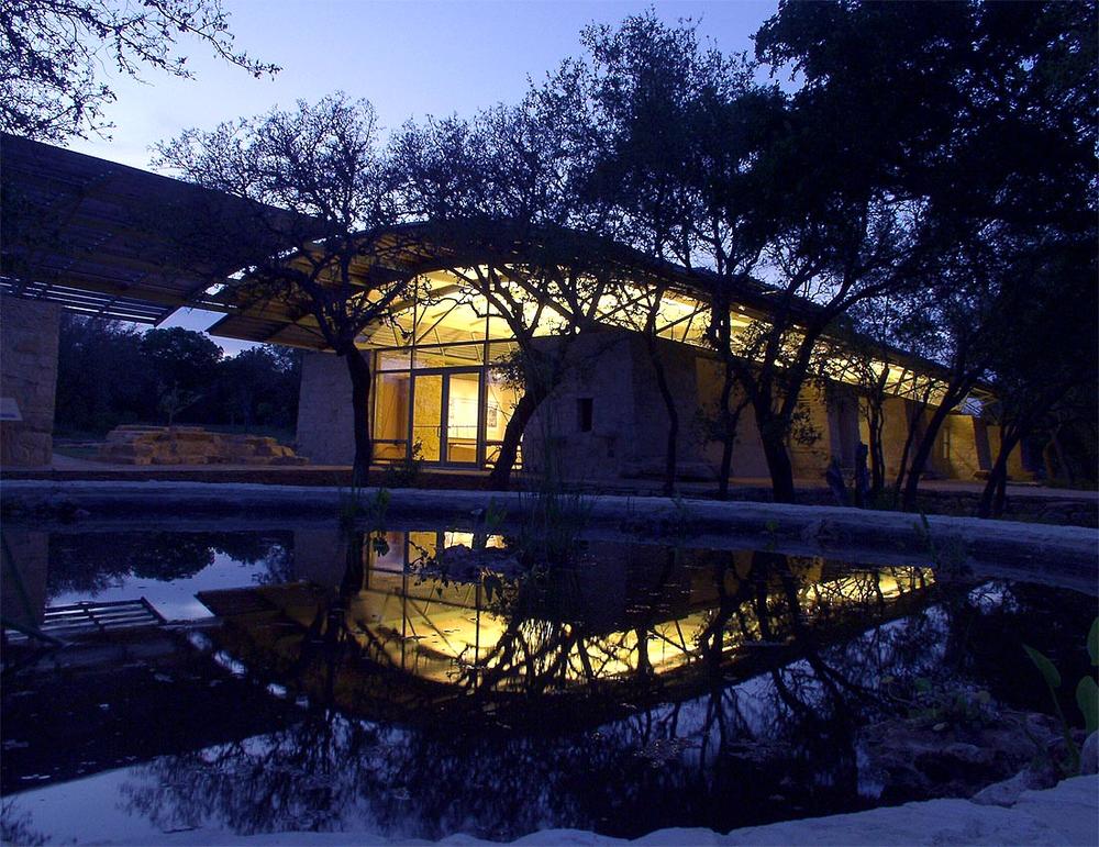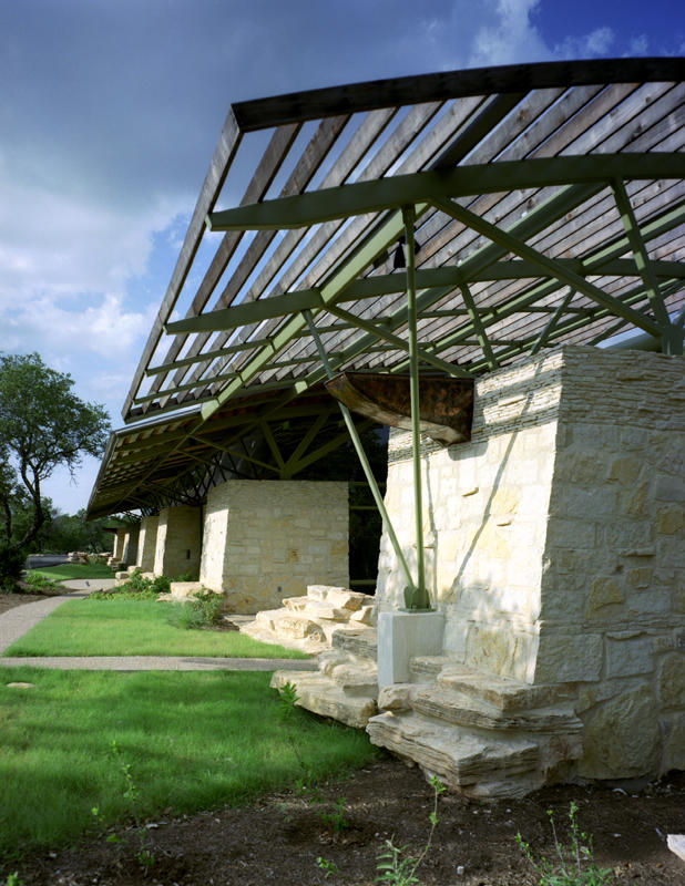 Glenrose stone from a nearby quarry was used. The Glenrose formation lines the banks of the Pedernales River just below the site. Fossils from the quarry are scattered throughout the walls. Natural cement-lime stucco with no coating was used for finish. The stucco is backed by staggered metal studs and recycled-content cellulose insulation. Recycled steel was used for the building's frame, and the concrete foundation includes 25% flyash. A metal standing-seam roof covers the building, and the roof decking is pine tongue-and-groove from a Texas forest. There is no finish coat on the wood.