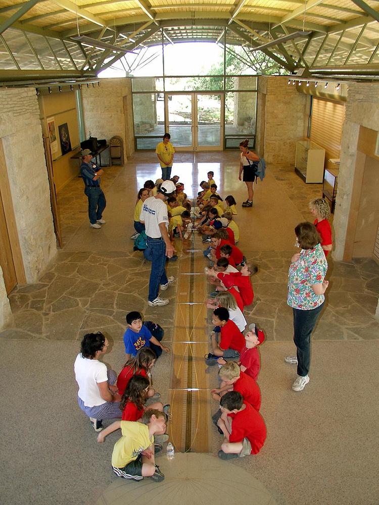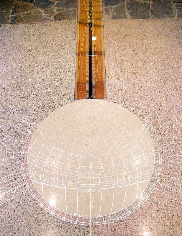 The building is aligned with the earth’s axis (true north-south on the western meridian), and a meridian line and sky map are embedded in the floor as educational exhibits. The building design also responds to this orientation with very large overhangs on the east and west, a covered exterior shelter on the north, and small overhangs on the south for passive heating in the classroom. The floor also illustrates "nature's numbers," featuring the enigmatic relationship between the Fibonacci series, golden rectangle, logarithmic curve, and form of a 90-million year old ammonite.