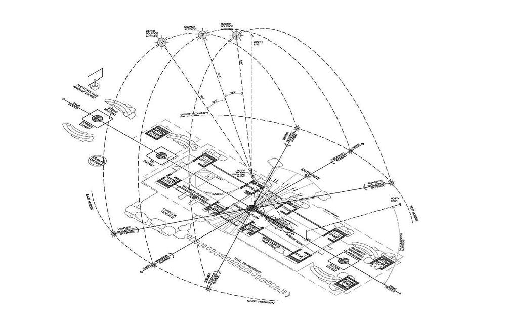 The site is aligned to Earth’s rotation (true north) to enhance exhibits about the earth and sun and to allow for views of trails to the uplands portion of the site and the canyon.