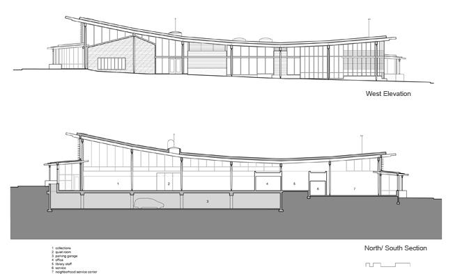 The new branch has self-checkout stations, 38 computers, a special area for teens, and a meeting room. The children's area in the building's prominent northwest corner overlooks the future municipal park space. Two study rooms provide space for tutoring and other activities, and a small conference room is available for meetings. A quiet room provides an alternative to the activity of the main reading room.