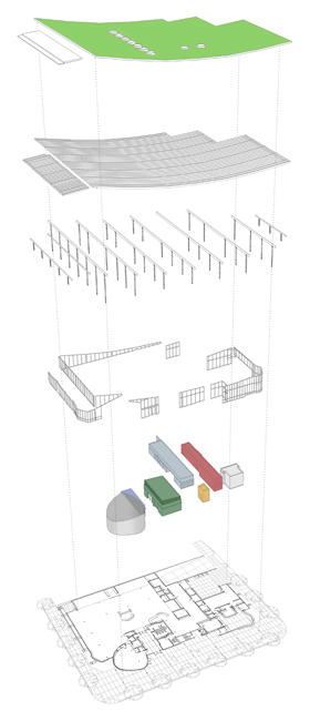 Major building components, selected for durability, are also recyclable or reusable. The glulam roof structure was erected with bolted connections, allowing for easy disassembly. Connectors and timbers could easily be salvaged for future use. The aluminum curtainwall is stick framed, and much of it could be reconfigured for reuse in smaller projects. The wood and galvanized metal siding was fastened with screws, allowing for disassembly and reuse. The concrete could be crushed and used for site walls or paving surfaces.