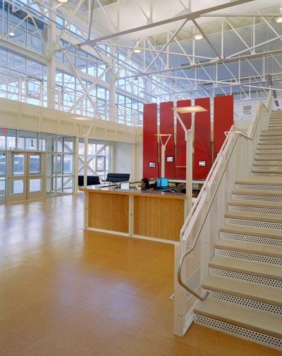 The project has become a landmark within the community and region. At 125 feet in height, the wind turbine is the most visible and kinetic element alongside the interstate. The building has been dramatically transformed—opened up visually and literally to the public. A courtyard welcomes visitors and leads them to an open two-story lobby. Visitors are educated about the project through environmental graphic displays, both in the lobby and on “main street,” within the building. A large meeting room is offered for community use. About 150 visitors tour the building each week due to great public interest. The project received a LEED(r) innovation credit for education and outreach.