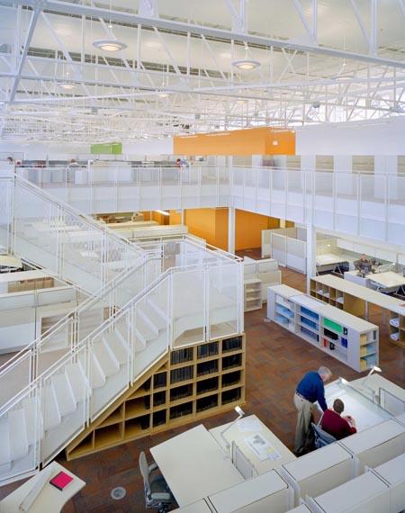 This project embodies the concept of “long life, loose fit.” The former manufacturing plant had generous dimensions, which led to the site selection and decision to adaptively reuse this structure. A new mezzanine level was inserted into the office area. A raised floor system was installed throughout the office area to accommodate air distribution as well as power and wire distribution. Fixed walls were kept to a minimum. Departmental boundaries are flexible, permitting the ebb and flow of staff size and work loads while fostering interaction. Except for three enclosed offices, everyone works in an open arrangement. Spaces can easily be reconfigured.