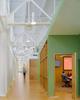 The interiors are organized around three large atria and receive abundant light, fresh air, and views to the outdoors. In addition to visually uniting the two floors, the atria act as thermal flues to induce ventilation. The open-plan environment fosters teamwork and collaboration while affording 90% of building occupants direct views to the outdoors.