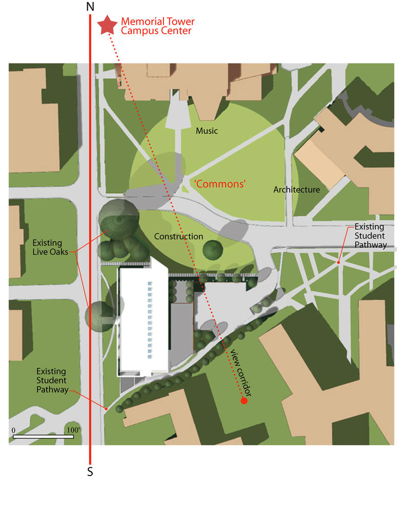 On weekends, the area northeast of the site becomes a picnic area for students and guests, especially during football season as the band practices and assembles for the parade. By extending the edge of this community space, Rinker Hall reinforces this important campus commons area.