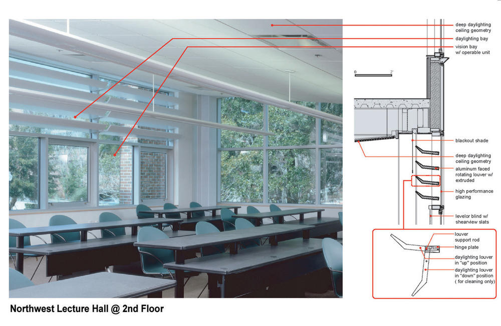 Rinker Hall is oriented on a pure north-south axis, demonstrating the ability to utilize low-angle light for daylighting. Egress paths from all classrooms at all levels are daylit, allowing for emergency exit during a daytime power failure.