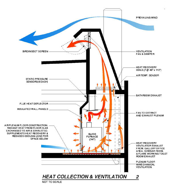 Ventilation is critical from a health standpoint due to the heat and particulates released during the glassworking process. Natural and mechanically assisted ventilation of the hotshop space is an engine for drawing air through a large section of the building. This system performs best during the swing seasons. In the heating months, nearly all of the building’s heat is processed for energy recovery. Approximately 63% of the building can be ventilated or cooled with operable windows.