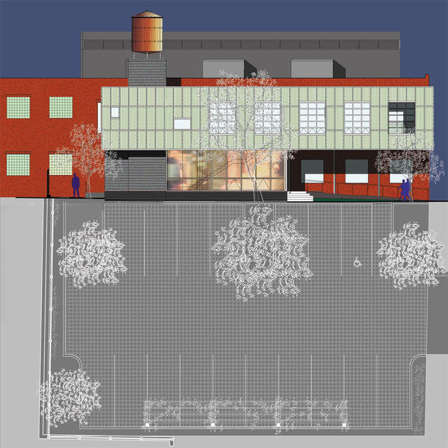 The existing condition of the site included a 15,000 ft2, two-story building (with a 7,500 ft2 footprint) with a traditional storefront entrance on Penn Avenue and an adjacent 5,300 ft2 vacant lot. The vacant lot had become a neighborhood dumping ground and included remains of foundation walls and concrete slabs and an asphalt access drive to the side door of the existing structure. The existing building measures approximately 40 feet wide by 187 feet long. The front (short side) of the building faces north and the vacant lot was to the east. An adjacent building abuts about 3/4 of the building's length for almost 1-1/2 stories. With the exception of the east elevation at the vacant lot and the rear setback along the alley, the building is built to the property line. These conditions presented building-code and fire-separation issues and made it difficult to prove access to natural light and ventilation.