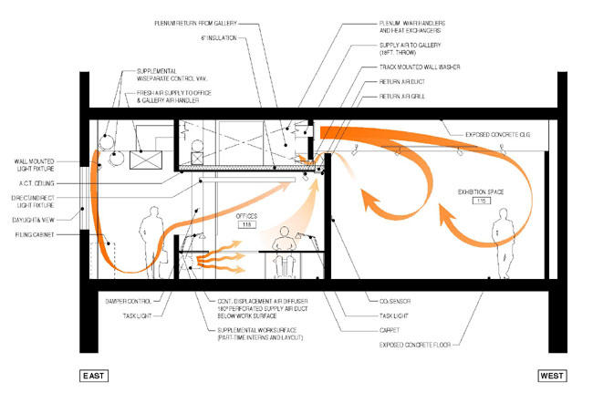 -Return air-to-air heat exchangers from "conventional" occupied spaces (the seminar room, gallery, and administrative area) to increase the quantity of fresh air and the efficiency with which it is delivered;