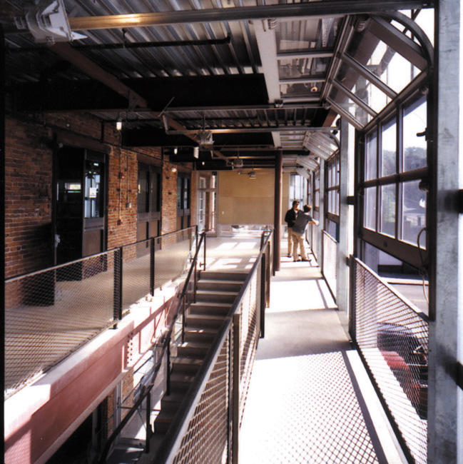 To achieve the goals relative to fresh air and increased, controlled daylight, despite the "zero lot line" building, the project team proposed a number of building-code variances to the City of Pittsburgh Bureau of Building Inspection. The team was successful on some, but not all of the requests. The building is technically mixed-use, requiring separations restricting the flow of light and air. Additional sprinklers and fire-alarm controls communicating with fans and equipment allow for an open stair to transfer air from space to space, and allow for a reduction in the rating of window openings to bring in more light. In addition to these features, openings in the roof provide north light and ventilation. All of the shop spaces receive light from above and from windows in the walls, or borrowed light from corridors. As per LEED calculations, 82% of the building's interior is daylit.