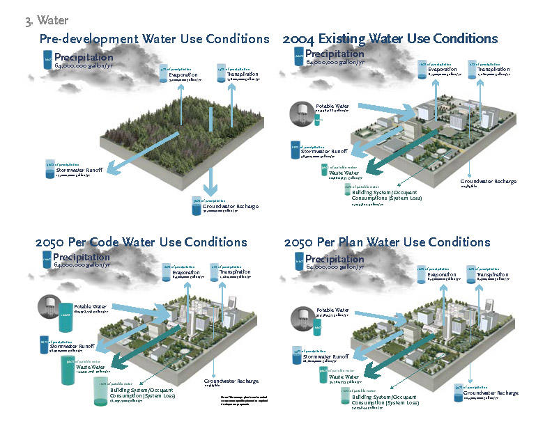 In order to reach the goal of living within the site’s annual rainfall budget of 64 million gallons, the plan recommends a 30% reduction in potable water use through efficient fixtures and, by 2050, the treatment and reuse of rainwater and blackwater for all nonpotable uses. This would result in a 62% reduction in water demand, compared to minimal compliance with code.