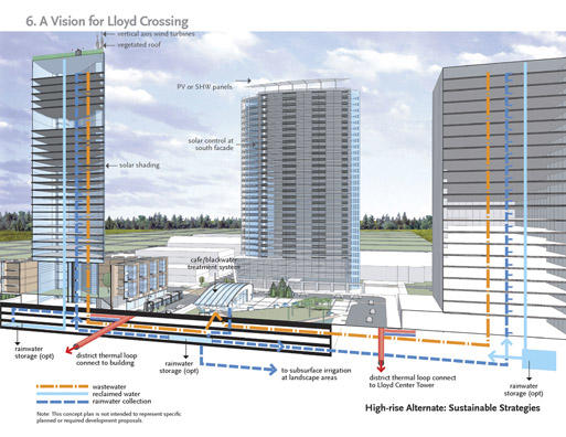 The Lloyd Crossing Sustainable Urban Design Plan integrates multiple sustainable strategies for energy, water, and habitat to transform and create a new identity for a 35-block, inner-city, commercial area of Portland. The plan lays out a new analytical, design, and economic framework for adding 8 million square feet of development over 45 years while dramatically improving the district's environmental performance. A four-block, mixed-use project, the Catalyst Project, will serve as a testing ground for key elements of the design plan.
