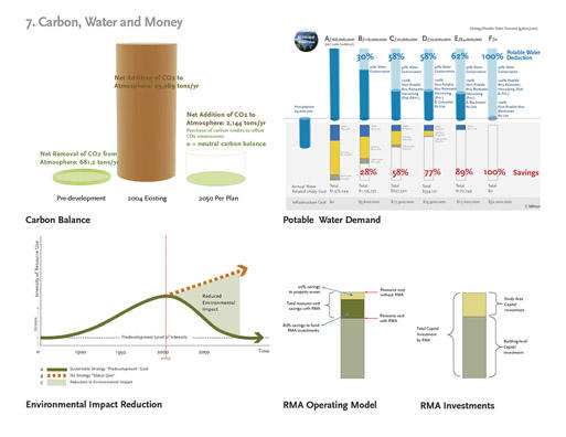 After initial goals had been set and the Predevelopment Metrics concept had evolved, there were many iterations of the strategy–payback cycle. Each idea or strategy was tested against the cost–benefit analysis for the district financial model. Benefit modeling included detailed analysis of the input and output flows of the district. These included carbon, water, solar energy, tree cover, etc.