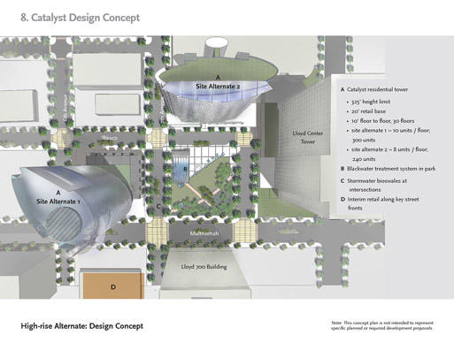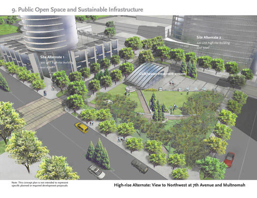 The Sustainable Design Plan vision is to preserve all the potential development area within the neighborhood. Over time this will reduce the pressure on development in areas outside Portland's urban growth boundary. Such sites which have less developed infrastructure and are more sensitive environmentally. The plan also recommends a combination of strategies for street-level and upper-level land use, street hierarchy, open space, landscape and habitat, ground-level building character, and tower setback requirements that would create a vibrant, attractive urban neighborhood.