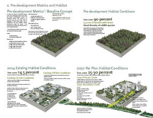 All of the Plan's key environmental strategies work toward the Predevelopment Metrics Goals in the categories of habitat, water, and energy. These goals provide the framework for evaluating and understanding the systemic nature of the interconnected design strategies.