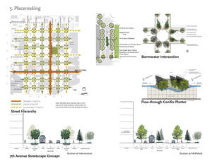 The stormwater-management approach mimics predevelopment watershed characteristics by using the natural flow of the site to capture and treat stormwater in a system of bioswales at the downhill side of each block and intersection. All of the stormwater generated from the rights-of-way will be treated and recharged into the ground. This stormwater strategy will improve river water quality and reduce demand on Portland's combined stormwater and sewer system. It will also increase landscape and habitat areas, unify the streetscape design concept, and create a unique pedestrian experience.