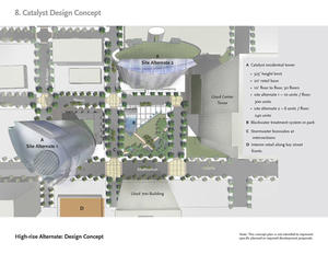 Water strategies within the Catalyst Project will include dual systems for supplying potable and reclaimed water, individual rainwater-harvesting systems, and a shared blackwater-treatment system to collect and treat all of the wastewater from the Catalyst Project and two existing office towers.