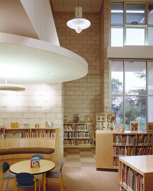 The library is a model of environmentally sustainable design, a civic landmark with an enduring presence that will serve its community for generations. Built of durable masonry, glu-lam beams, and metal roofing, the building is designed for a "long life," but it is wired and ducted for flexibility and a "loose fit." Interior spaces were conceived as large rooms with diverse functions defined by furniture and equipment that can be reconfigured, as needs change. Outdoor spaces are designed for possible future incorporation into the main body of the building, or to enhance its present functionality as a place for special programs, performances, and outdoor learning.